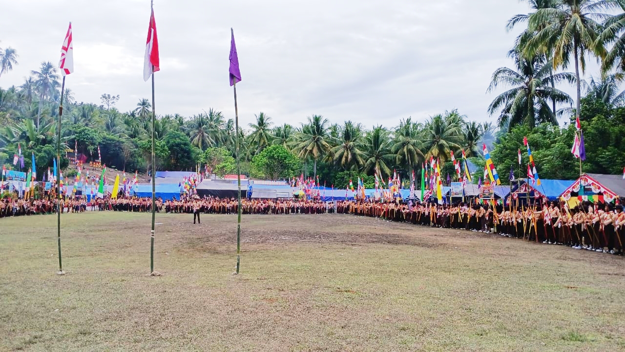 Tepat pukul 15.00 WITA, kegiatan resmi dimulai. Bendera-bendera kontingen berkibar gagah di sepanjang area perkemahan, sementara suara yel-yel para peserta menggema memecah udara sore di tengah perkampungan Uwedaka. Semangat Pramuka tampak menyala di wajah setiap peserta yang bersiap mengawali rangkaian kegiatan penuh keceriaan dan tantangan.
